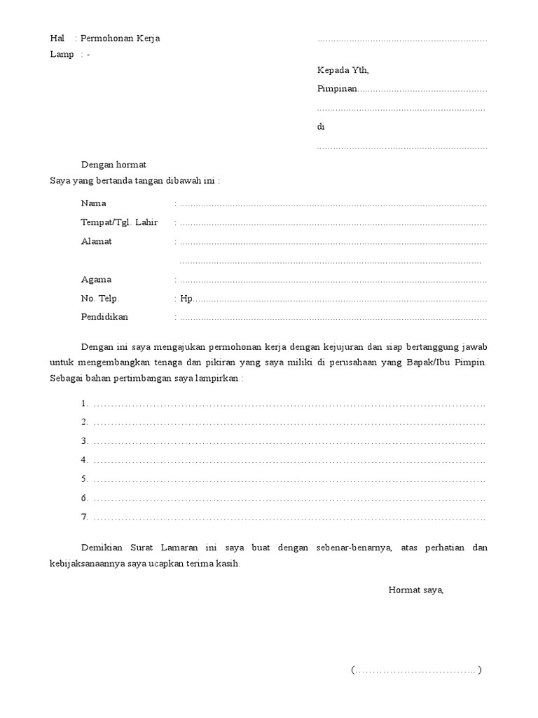 Berikut contoh surat lamaran pekerjaan yang bisa kamu download file dokumennya juga, link di bagian akhir artikel. Contoh surat lamaran pekerjaan untuk beberapa sumber informasi lowongan, diambil dari sumber di internet dan dilakukan modifikasi, semoga bermanfaatfull description. Berikut ini dapat anda download contoh surat lamaran kerja guru paud, tk, sd, mi, smp, sma, smk, bimbel, yayasan, honorer yang masih kuliah sekalipun berbentuk doc maupun pdf. Please fill this form, we will try to respond as soon as possible. Dalam menulis surat lamaran kerja ada beberapa hal yang harus anda pahami terlebih dahulu. Sebagai pertimbangan saya lampirkan beberapa berkas dan dokumen pendukung yang bisa bapak/ibu download dibawah ini seperti contoh surat lamaran kerja via email format pdf posisi marketing. Surat lamaran kerja termasuk salah satu surat resmi yang umumnya dijadikan sebagai format pengantar berbagai lampiran dokumen yang terkait. Please fill this form, we will try to respond as soon as possible. Share & embed surat lamaran kerja. Surat lamaran kerja adalah syarat pokok bagi para pencari kerja jika ingin melamar pekerjaan. Please copy and paste this embed script to where you want to embed. Sebagai syarat administrasi tentunya menulis surat lamaran kerja memang harus tepat. Contoh surat lamaran kerja yang berformat doc dan juga pdf bisa dikirimkan lewat email seperti surat lamaran kerja guru, bank ataupun bahasa inggris.