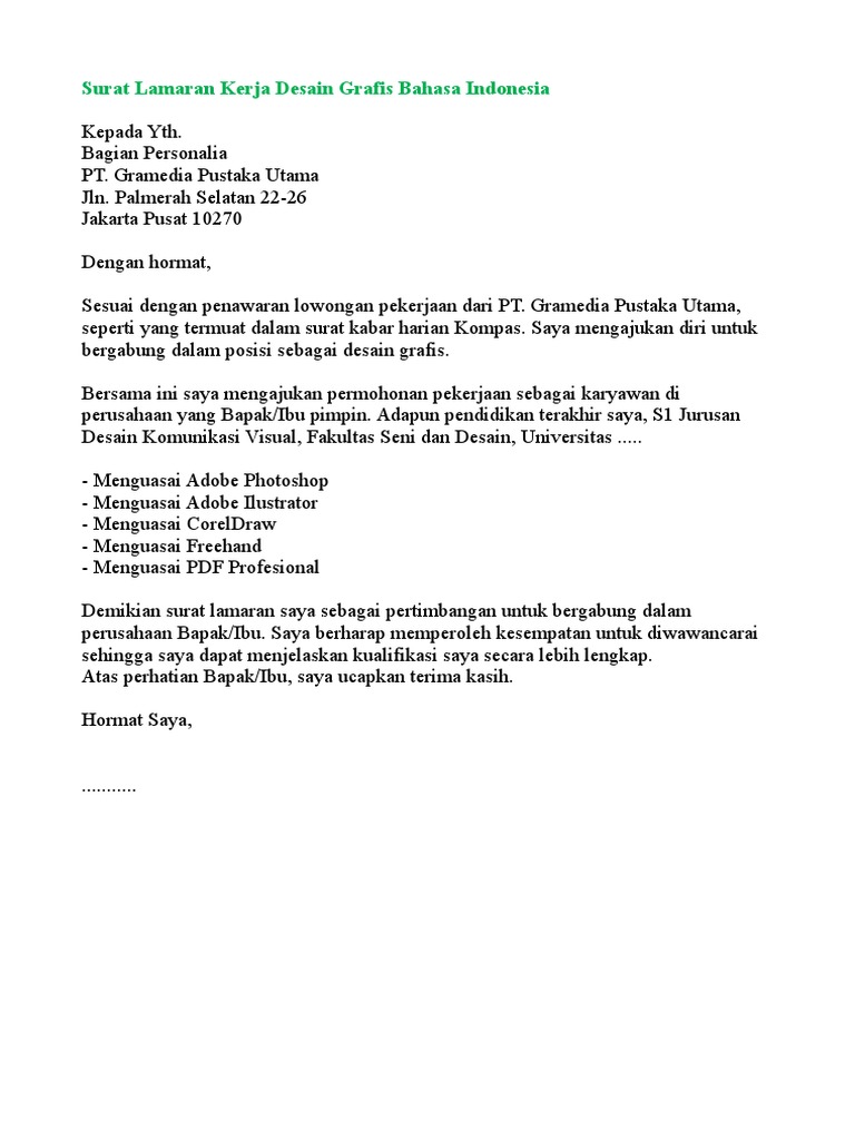 Contoh surat lamaran pekerjaan berikut ini kami sajikan kepada para pelamar atau pencari kerja agar lebih mudah dan cepat saya memiliki kemampuan desain web dan grafis serta kemampuan office seperti excel. Word, exel demikianlah tadi artikel dari dosenpintar.com mengenai √ 10+ contoh surat lamaran kerja : Like (suka), share (bagikan) jika bermanfaat. Contoh cv yang menarik untuk bekerja di desain grafis. Contoh surat lamaran kerja bahasa inggris fresh graduate. Contoh surat pengantar lamaran kerja via dreambegins.com. Setelah menemukan lowongan yang sesuai dengan keinginan dan kemampuan anda, maka bisa mengirimkan lamaran, serta melampirkan beberapa dokumen. Contoh surat lamaran kerja bahasa inggris untuk posisi desain grafis. Mau video seperti ini setiap hari? Selain itu surat lamaran kerja ini dibagi menjadi tiga bagian. 10 tenaga ahli seo (tas) 5. Selain itu saya juga memiliki kemampuan bahasa inggris baik lisan maupun tertulis. Panduan cara membuat surat lamaran seperti lamaran umum, fresh graduate, via email, tulis tangan skill dan keterampilan.